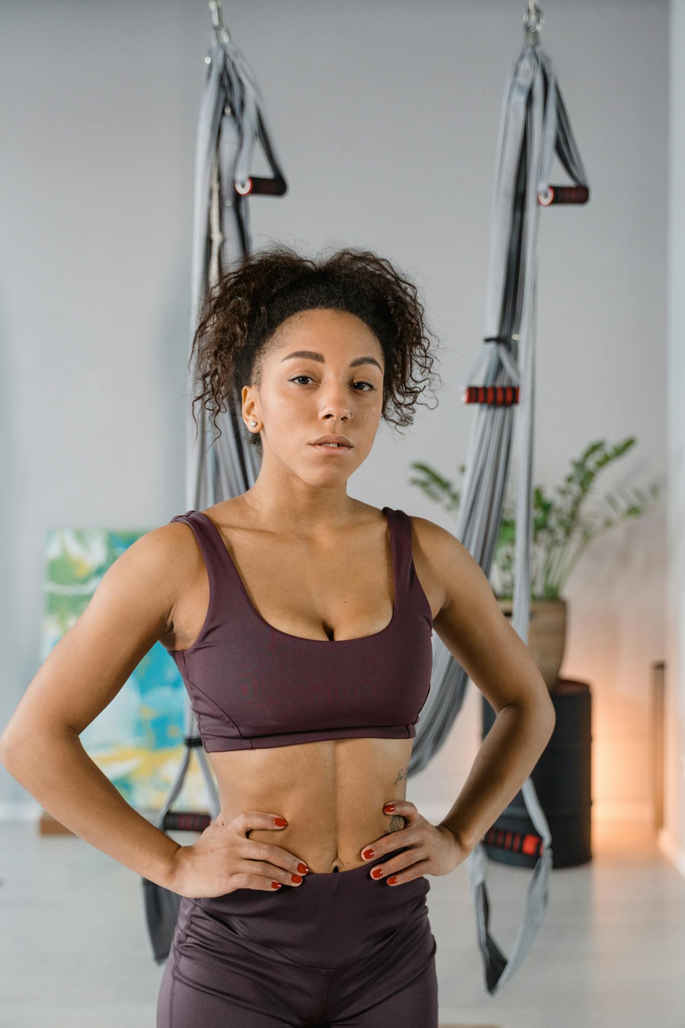 A confident woman in activewear stands poised in a fitness studio with aerial yoga hammocks.
